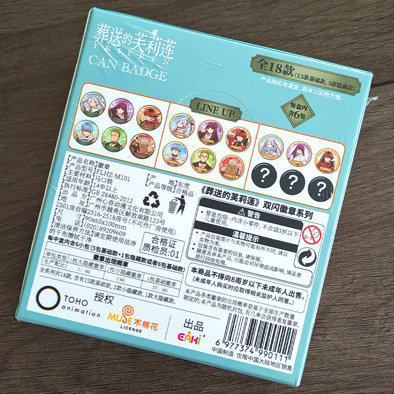Each box contains one randomly packed metal pin badge featuring beloved characters like Frieren, Fern, Stark, Himmel, Heiter, and Eisen. Collect them all — including rare hidden designs for true fans!