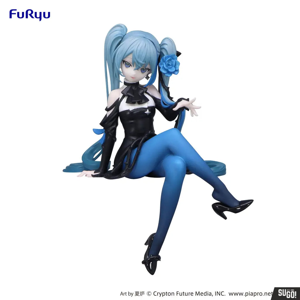 Bring elegance to your shelf with this ethereal Hatsune Miku figure from FuRyu’s Noodle Stopper series. Inspired by the mystery of blue roses, Miku appears in a sleek black and blue fairy dress, seated gracefully on a translucent pedestal—perfectly designed to rest on the edge of your cup or shelf.